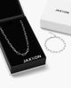 Discover timeless allure with our 5mm silver Paperclip Chain and Bracelet Set, meticulously crafted from 925 sterling silver and finished with precious rhodium. The elongated links of the paperclip chain exude modern minimalism, providing a subtle yet striking touch to your everyday style. Whether worn individually or layered, this set's versatility and refined craftsmanship make it a must-have addition to your jewelry collection.
