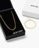 Introducing our 5mm gold Paperclip Chain and Bracelet Set, a contemporary fusion of elegance and modern style. Crafted from high-quality 925 sterling silver bonded with opulent 14k gold, the flattened links of this set create a sleek silhouette that effortlessly elevates any ensemble. With its adaptable design and luxurious finish, this set is the perfect statement piece for those who appreciate both fashion and sophistication.